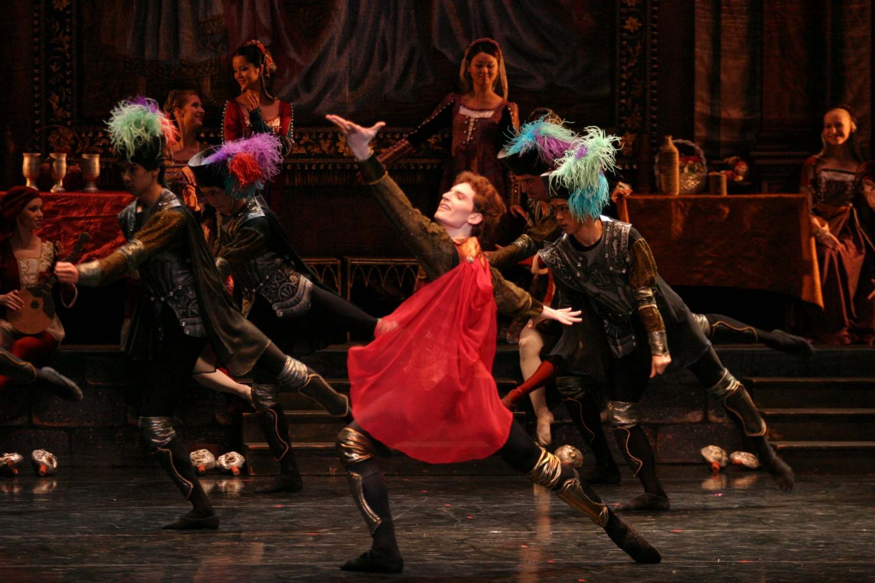 Juliet is in her bedchamber teasing her nurse. It is her 14th birthday. Her cousin Tybalt, arrives with a beautiful gown and she dances with glee at the prospect of her first Ball.   As guests arrive Romeo and his Montague friends appear uninvited and Lord Capulet grants them permission to stay. The three friends enter the house wearing masks as Juliet dances with her suitor Paris. She is eager to find out who is beneath the mask and Romeo reveals his identity and boldly embraces Juliet. Tybalt recognizes his enemy Romeo and only the intervention of Lord Capulet prevents Romeo being injured. Romeo’s friends decide to make a swift departure dragging Romeo with them. That evening Juliet stands on her balcony overlooking the garden when Romeo arrives and the two young people declare their eternal love for each other.