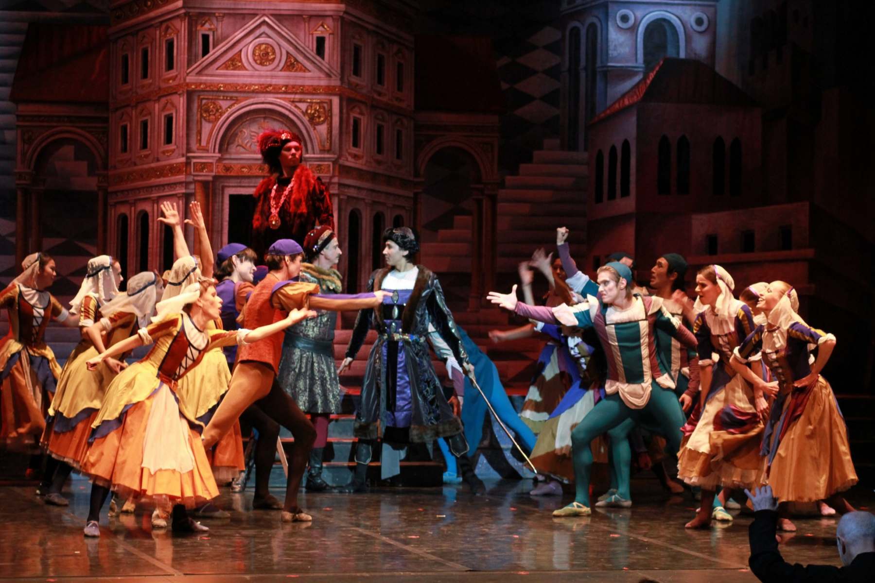In the town square the Montagues and Capulets engage in light-hearted horseplay. The two Houses taunt one another and a fight breaks out which is interrupted by the arrival of the Prince of Verona, who orders the fighting to cease.  The two Lords are forced to kneel and pledge their obedience.